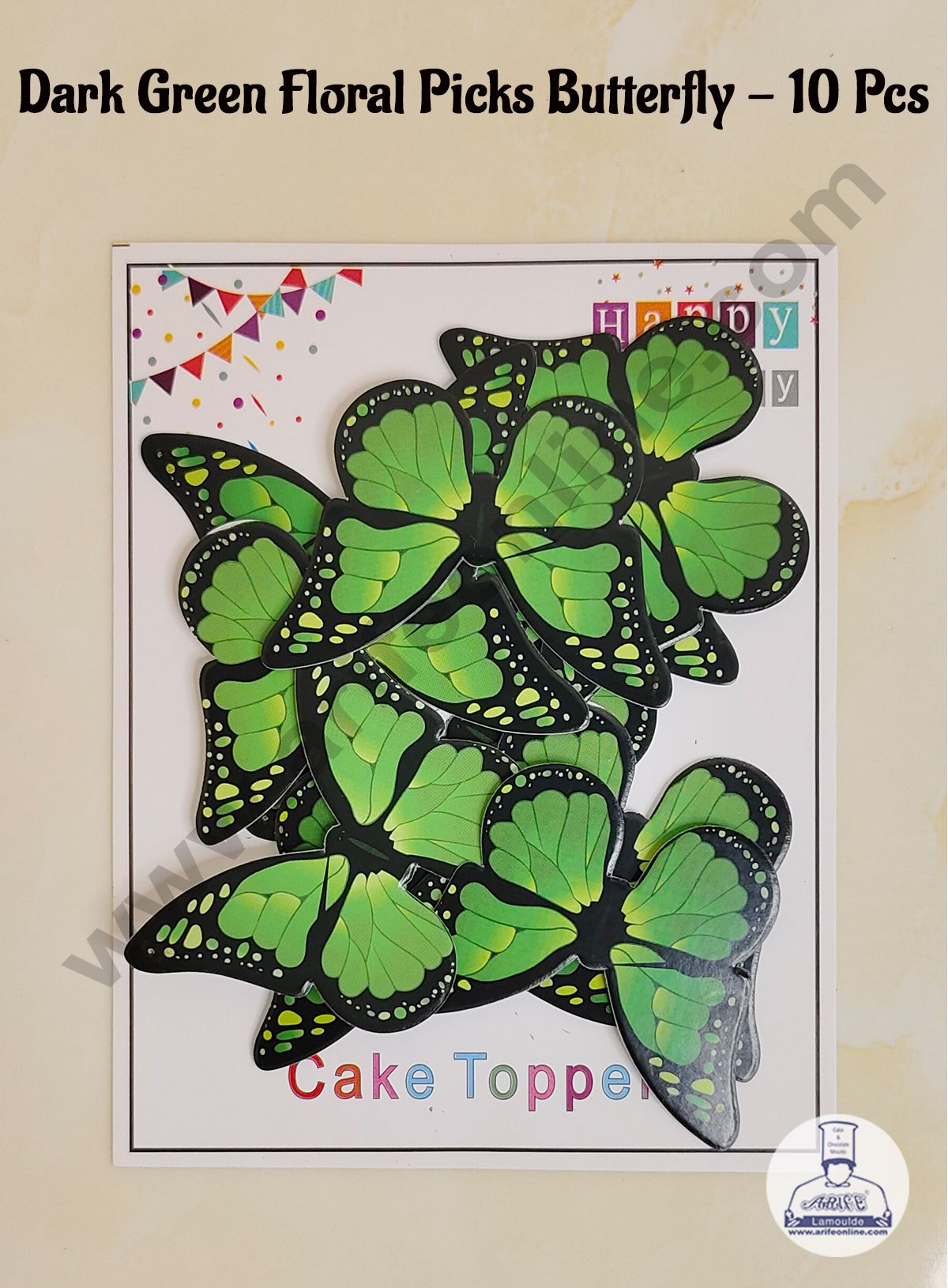 CAKE DECORβ’ 10 Pcs Dark Green Floral Picks Butterfly With Black Outlines Paper Topper For Cake And Cupcake