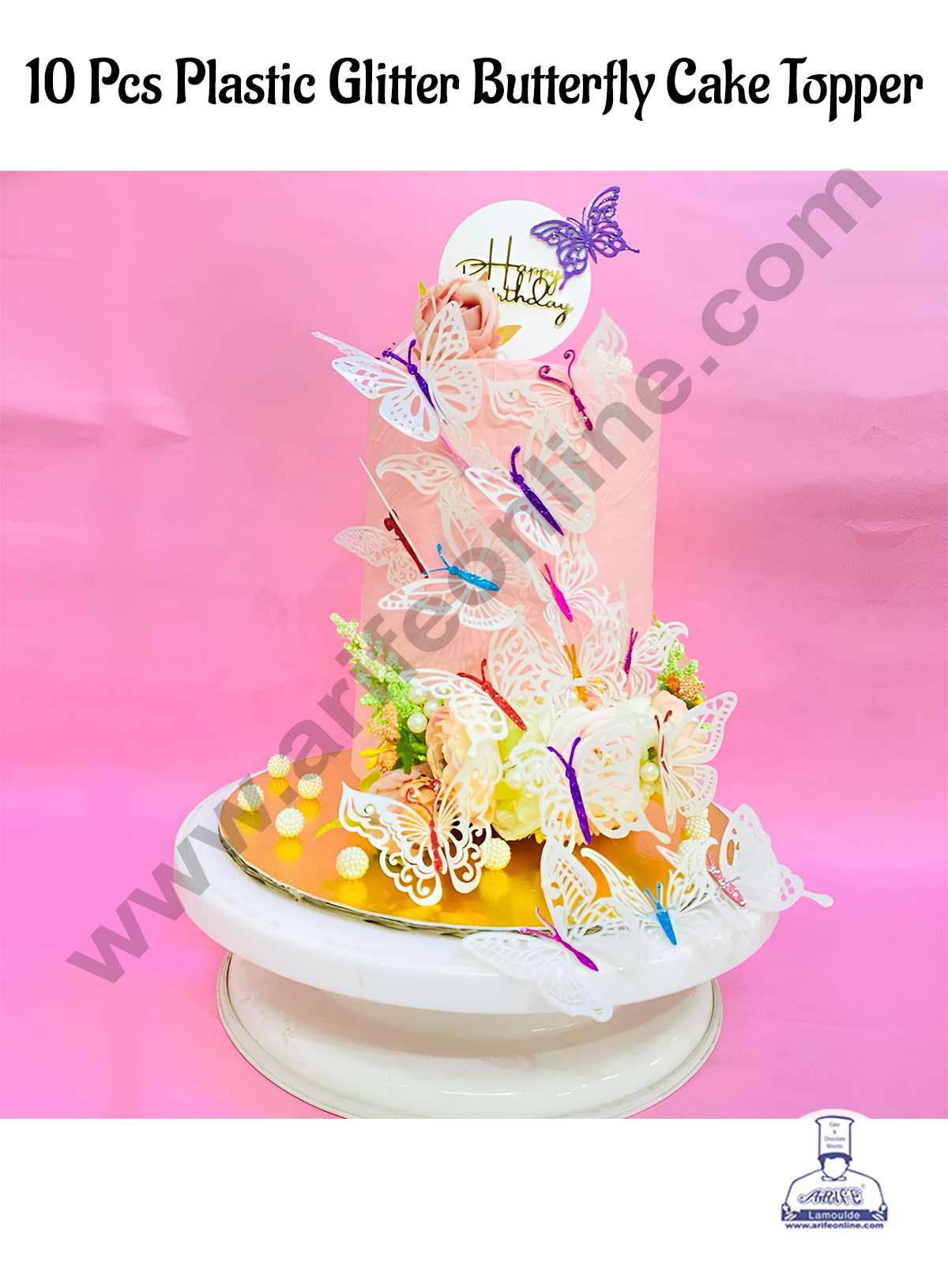 CAKE DECOR™ 10 Pcs Plastic Glitter Butterfly Topper For Cake And Cupcake (SBMT-PT-189)