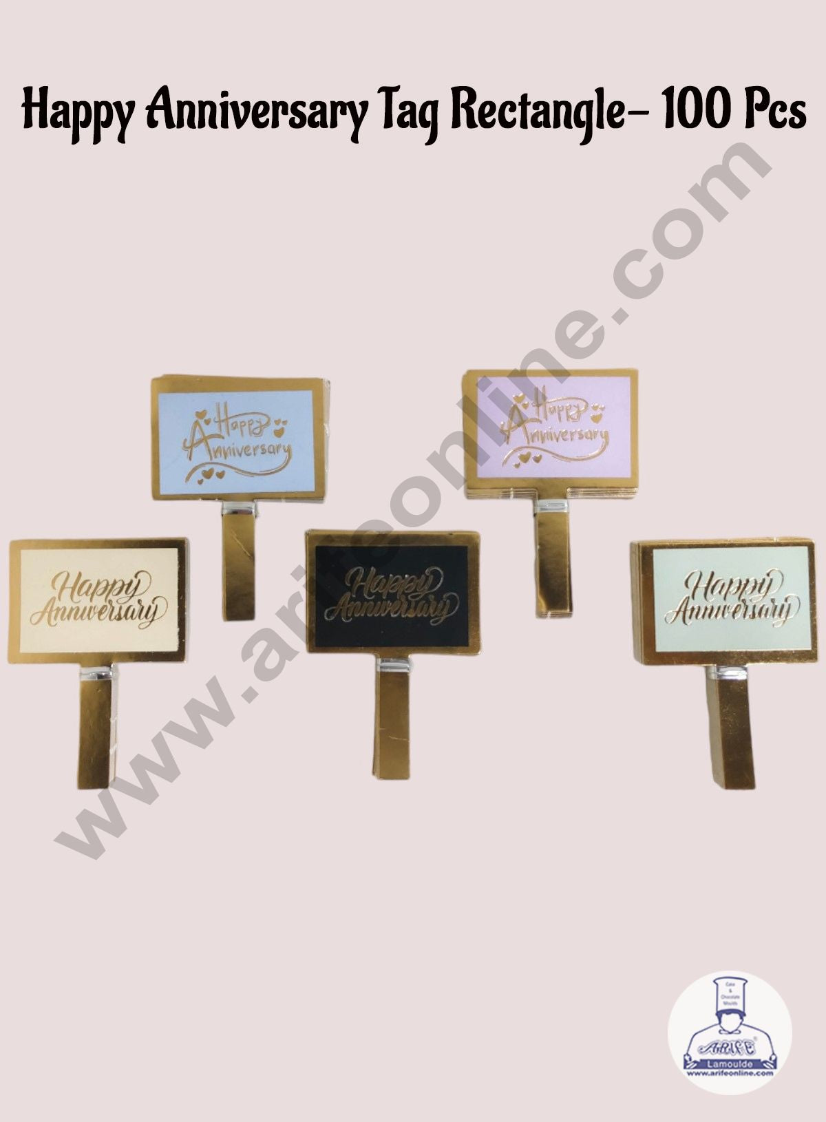 CAKE DECOR™ 100 pcs Rectangle Happy Anniversary Paper Tag with Foiling Paper Topper For Cake And Cupcake