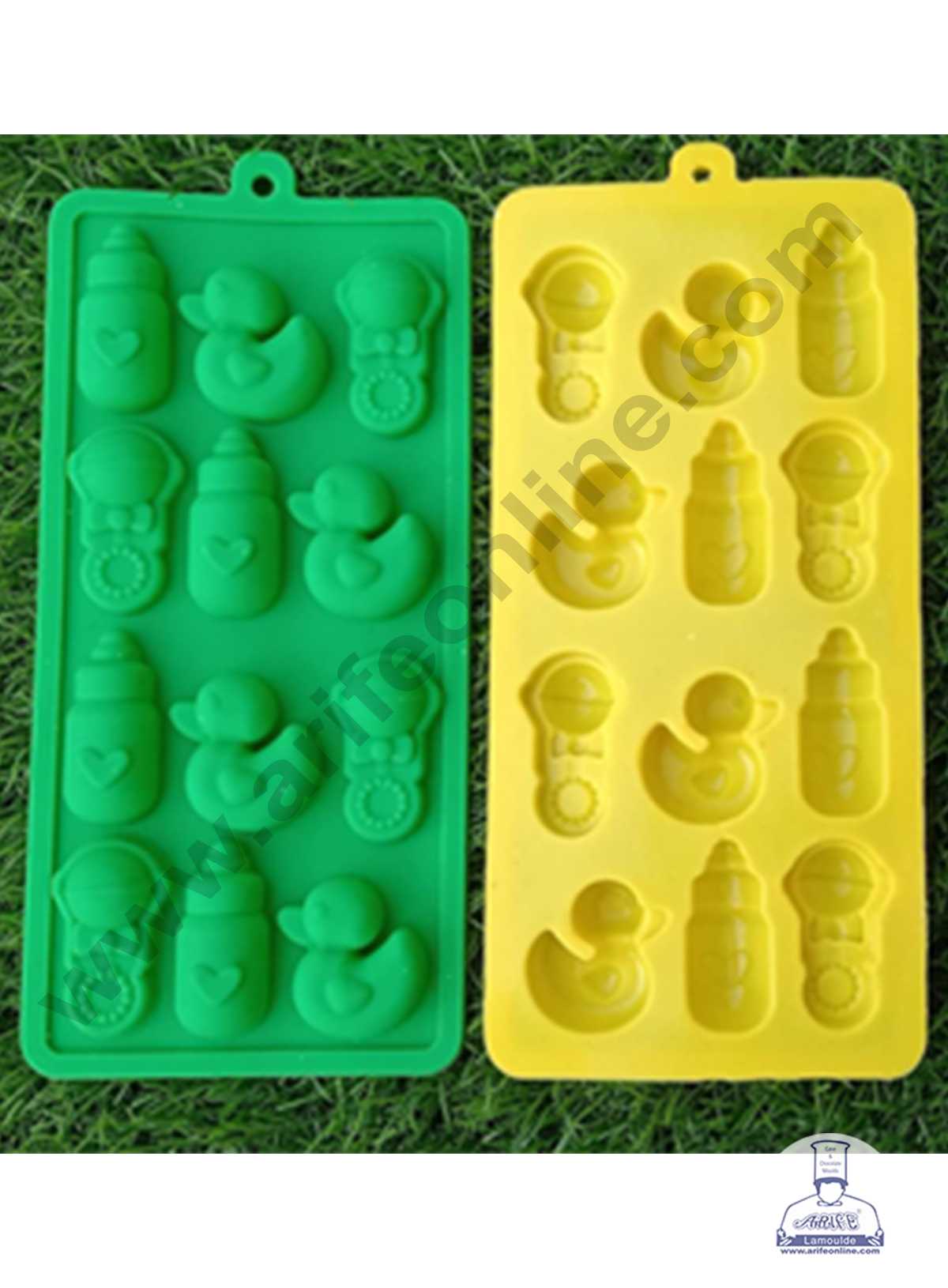 CAKE DECOR™ 12 Cavity Baby Bottle Baby Rattles Duck Shape Silicon Chocolate Mould, Ice Mould, Chocolate Decorating Mould (SBSM-895)