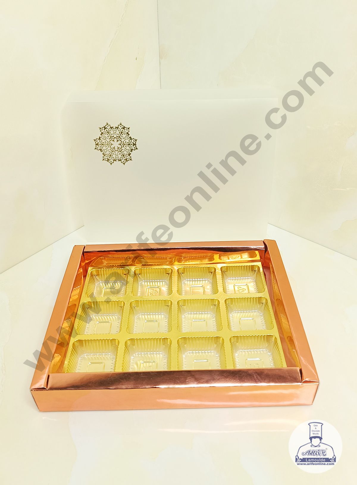 CAKE DECOR™ 12 Cavity Metallic Design Chocolate Box with Sliding Cover & Cavity ( 10 Piece Pack ) – Rose Gold