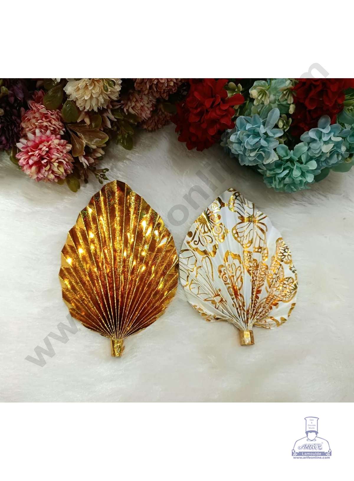 CAKE DECOR™ 2 pcs Gold Palm Leaves with One Side Design Paper Topper For Cake Decoration – Gold & White ( SBMT-PL-11 )