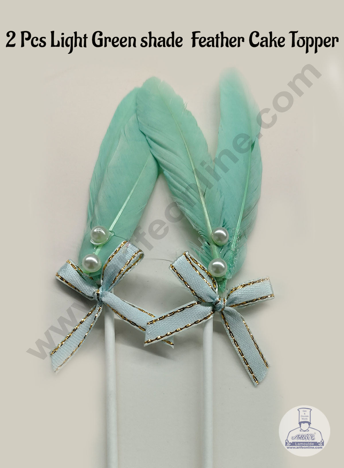 CAKE DECORβ’ 2 Pcs Light Green Shade Feather Topper For Cake Decoration Features : Save time, no assembly, easy to use. Very nice and sturdy cake topper. Safe and non-toxic, can be used with confidence. Celebrate your Occasion with this adorable cake topper. Perfect for photos to remember your special day. No more squiggly writing…