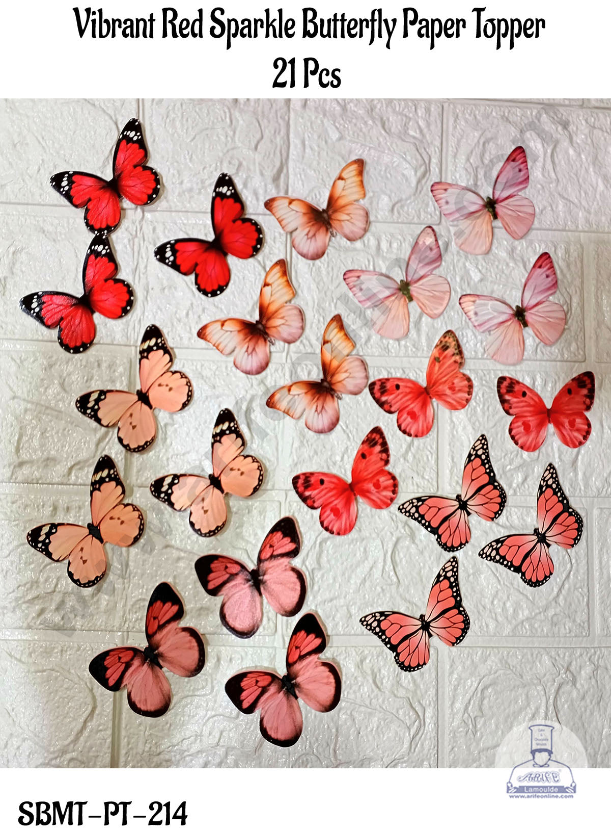 CAKE DECOR™ 21 Pc Vibrant Red Sparkle Butterfly Paper Topper For Cake And Cupcake