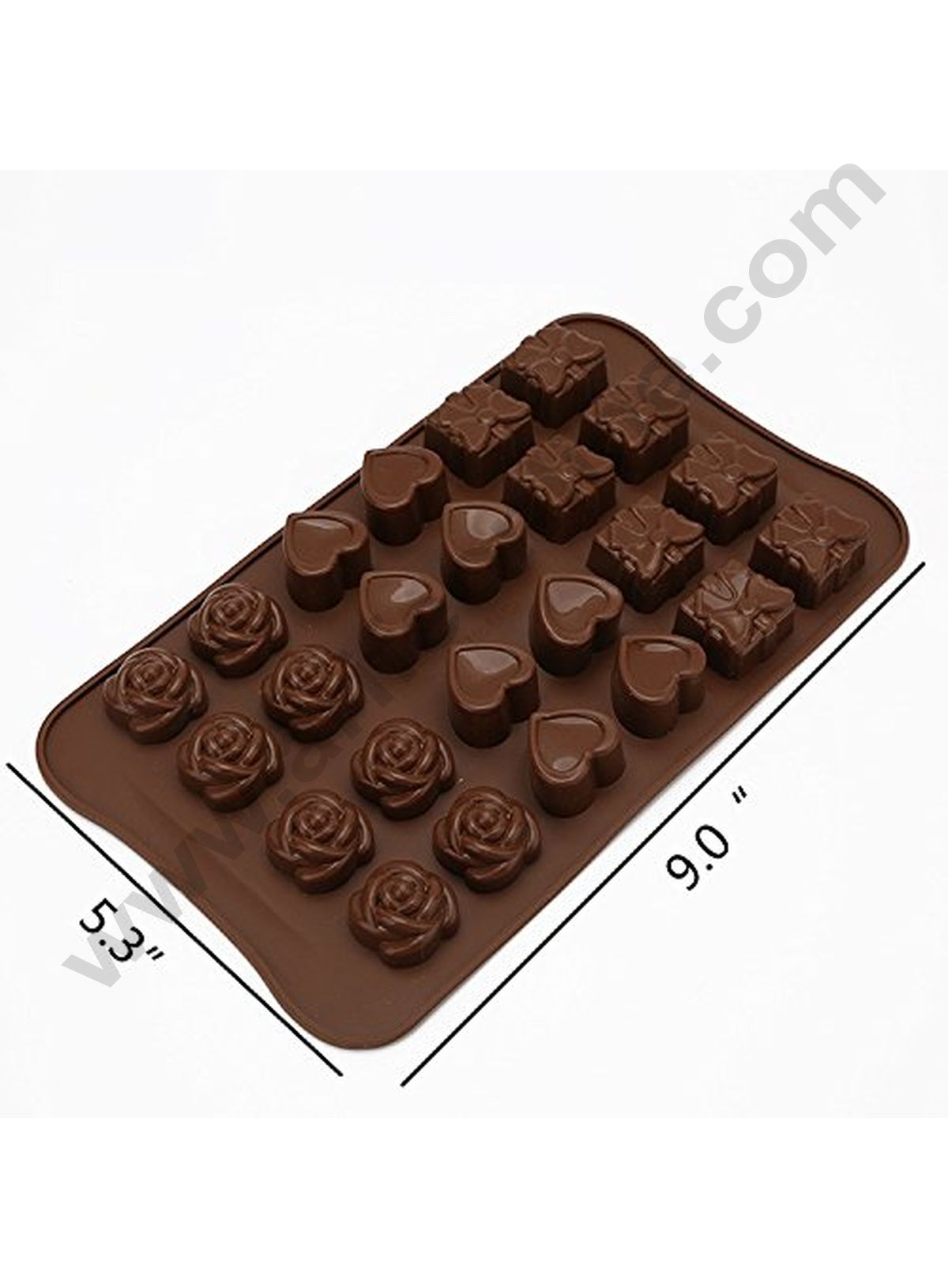 Chocolate Moulds are made of 100% food-grade silicone material, innocuous, non-radiate. Non-stick finish. Temperature range: -40 to 230Β°C. More durable and longer lifespan. Dishwasher safe. Material: High food Grade Silicone. Shape: (As per stock Available). Cavities: Number of Cavities May Differ. Method for Preparation: Break off pieces of chocolate. Melt the chocolate in the microwave. Fill the Cavities of Chocolate Mold with the chocolate. Tap the mold lightly on the work surface to eliminate air bubbles. Place the mold in the refrigerator for about 20 minutes. Care & Cleaning Instructions:Never use sharp metal tools to remove or cut food from the mold. Never use mold on direct heat, stove tops, or hot plates. Never clean with abrasive soaps or scouring pads. To clean soak in warm soapy water & wipe clean. In the Box: 1 x Chocolate Mold
