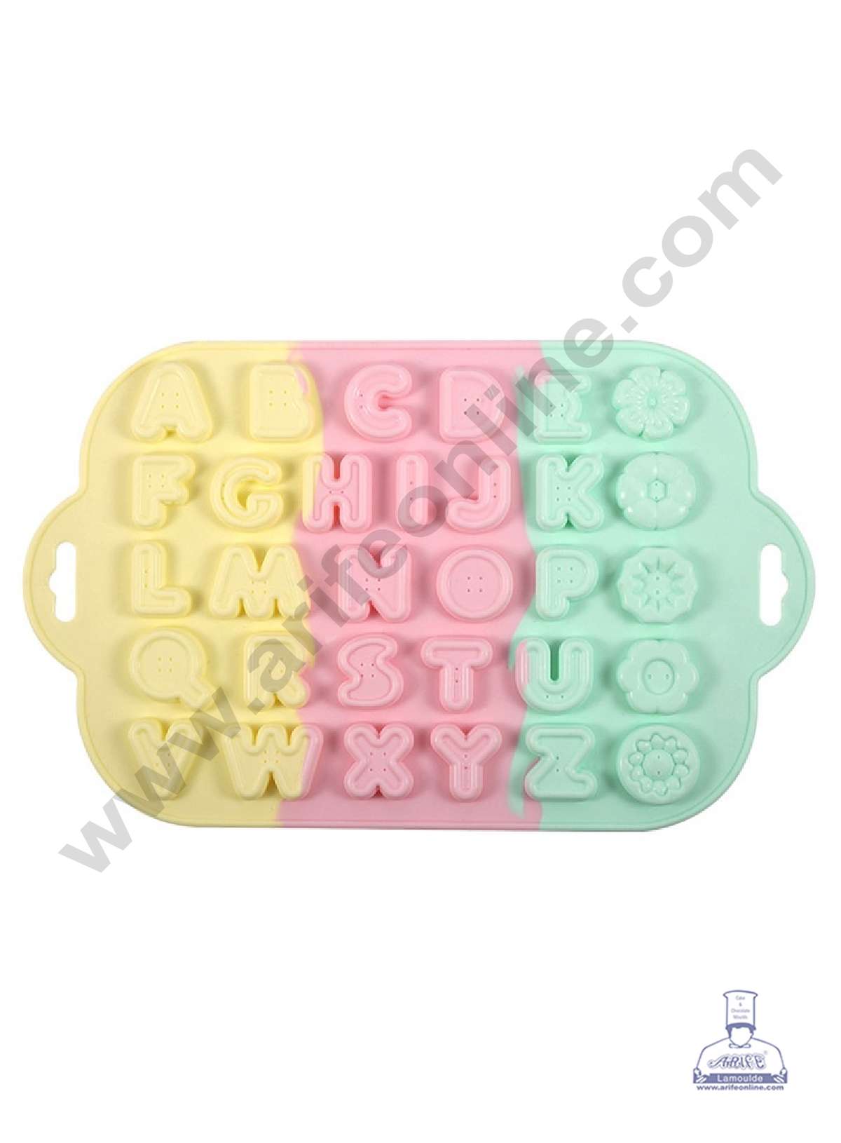 CAKE DECOR™ 26 Cavities Alphabets with mix flowers Button Theme Rainbow Silicone Mould Silicon Muffin Mold SB-ZU181