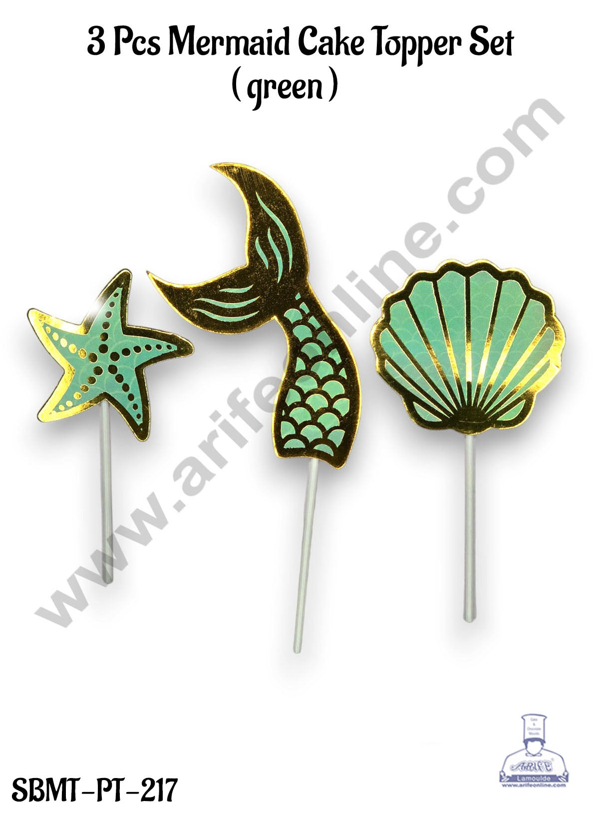 CAKE DECOR™ 3 Pcs Green Mermaid Cake Topper Paper Set Features : Size : approximately with sticK : Mermaid Tail : 14 cm Star Fish : 9.5 cm Seashell : 10.5 cm Set of 3 elements Non edible Save time, no assembly, easy to use. Very nice and sturdy cake topper. Safe and non-toxic, can…