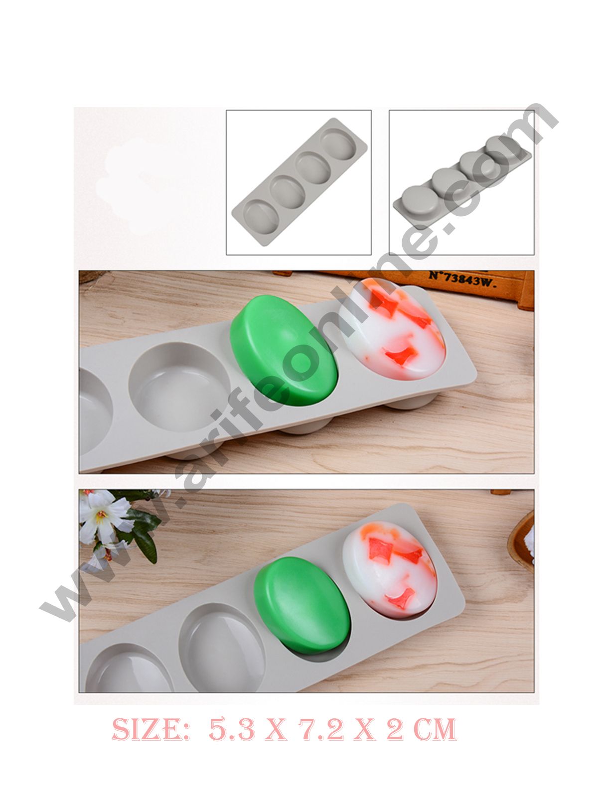 Cake Decor 4 Cavity Oval Silicone Moulds for Soaps and Chocolate Jelly Desserts Mould Description Silicone mould Color: Random Cavity Size: 5.3 x 7.2 x 2 cm Dishwasher, refrigerator, freezer and microwave safe;Flexible and Reusable Good for homemade soap making tool, Handmade soap DIY mould , Cupcake muffin cups ,Craft Art DIY tool