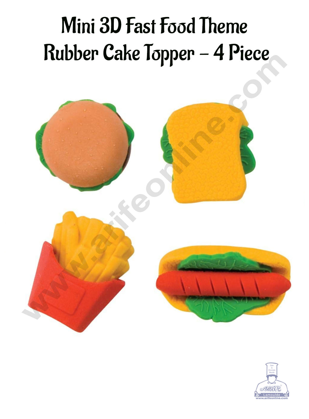 CAKE DECOR™ 4 Pcs Mini 3D Fast Food Theme Rubber Cake Topper | French Fries | Burger | Sandwich | Hot Dog (SBT-R-018)