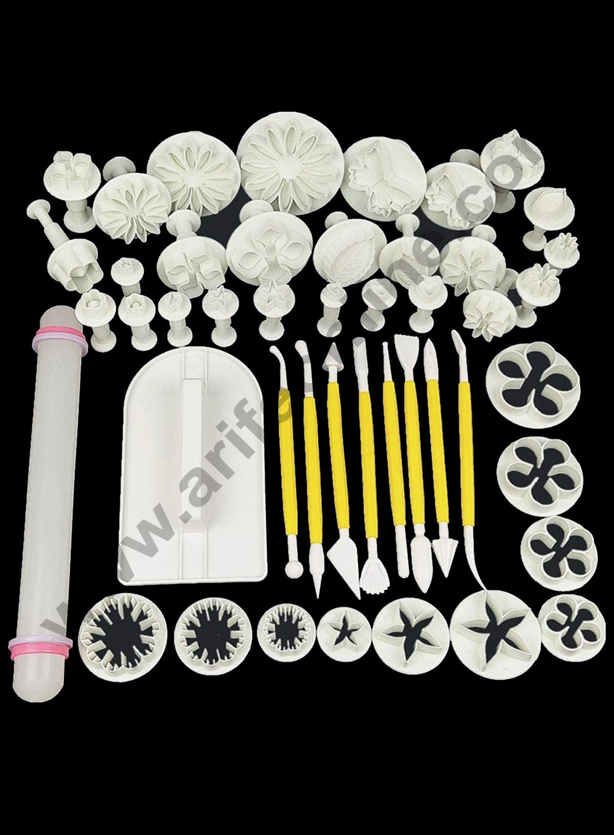 Package included 36 plunger cutters, 8 modeling tools, 1 rolling pin and 1 smoother.