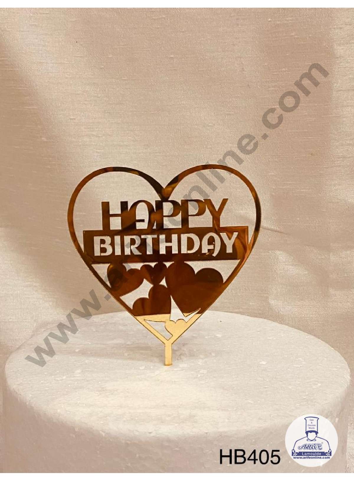 Gold Acrylic Bold Happy Birthday with Heart Cutouts in Heart Frame Cake Topper.
