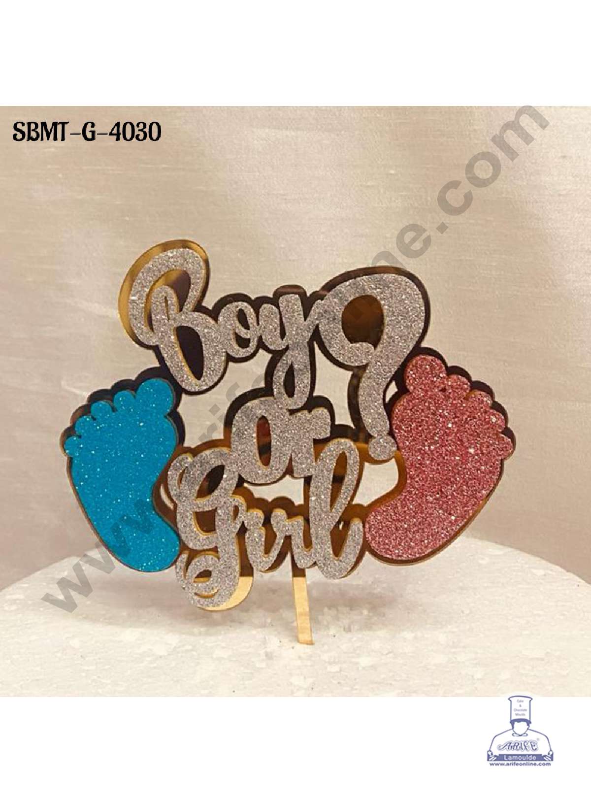 CAKE DECOR™ 5 inch Acrylic Glitter Boy Or Girl with Foot Print Cake Topper (SBMT-G-4030) Gold Acrylic Glitter Boy or Girl with Foot Print Cake Topper. Celebrate your Ocassion with this adorable cake topper. Perfect for photos to remember your special day. No more squiggly writing with icing and spelling mistakes on your cake. Beautiful…