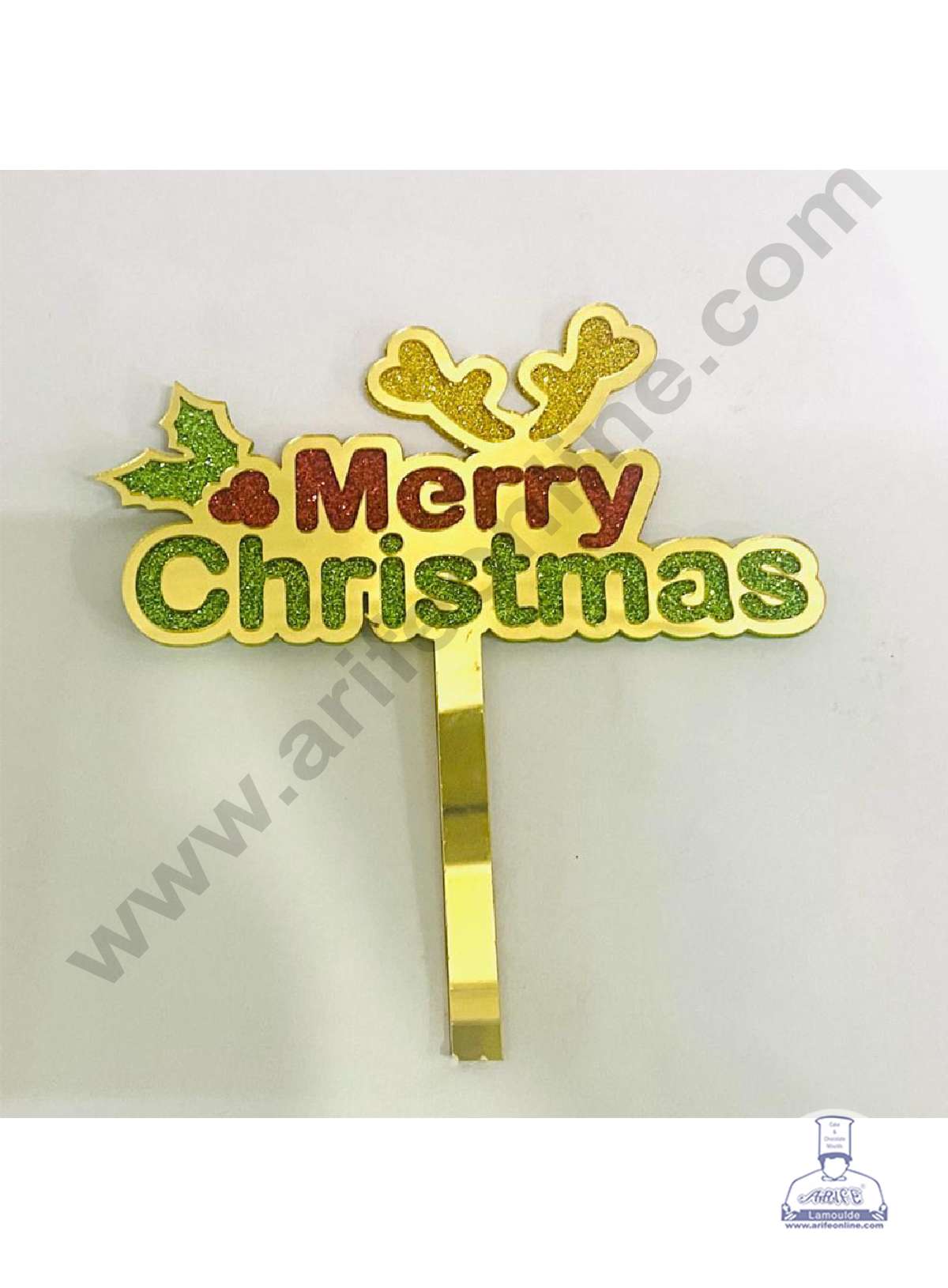CAKE DECOR™ 5 inch Acrylic Glitter Merry Christmas with Reindeer Horns & Leaf Cake Topper Cake Decoration (SBMT-G-6059)