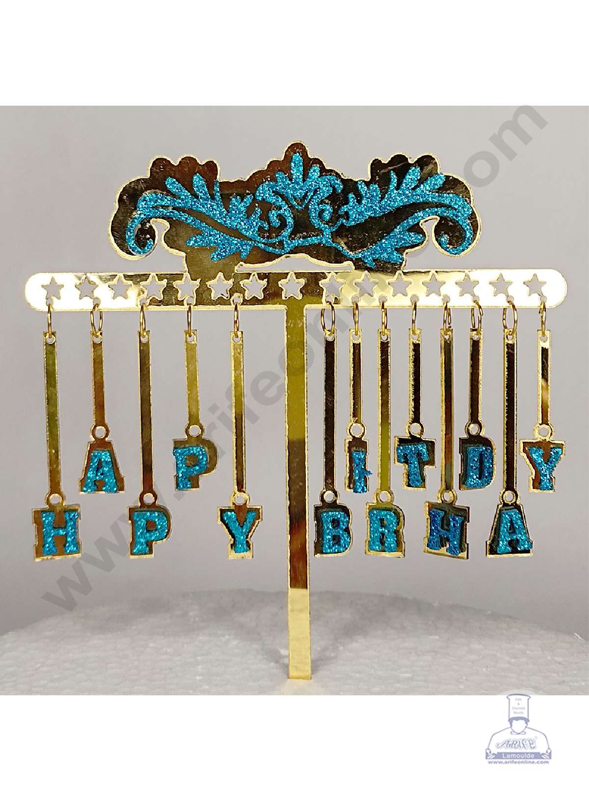 Gold Acrylic Happy Birthday Hanging Blue Glitter Heart Cake Topper.
