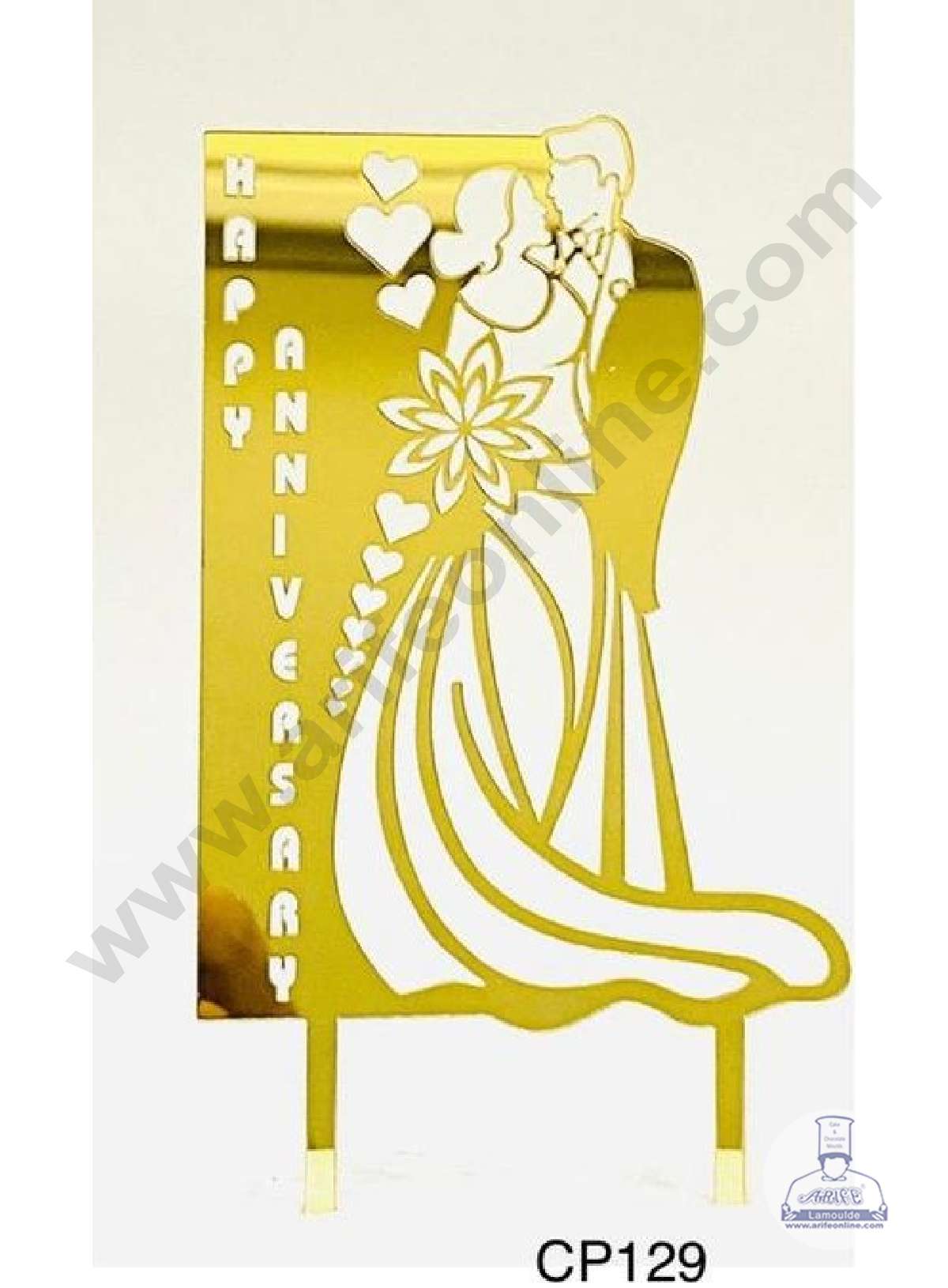 Gold Acrylic Happy Anniversary Cutout Wedding Couple Cake Topper.