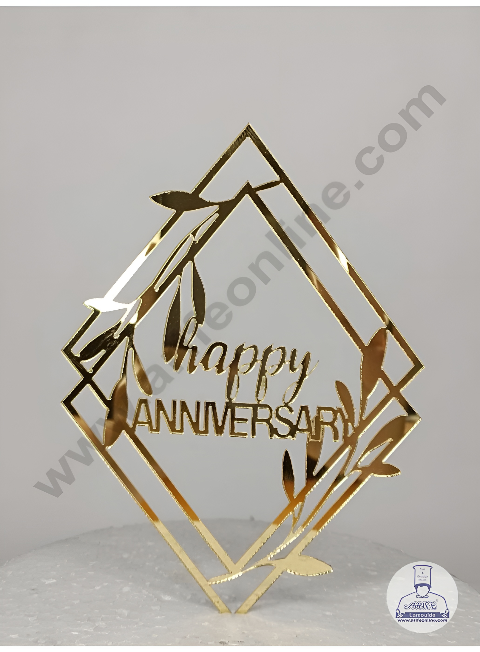 Gold Acrylic Happy Anniversary with Leafy Diamond Shape Cake Topper.