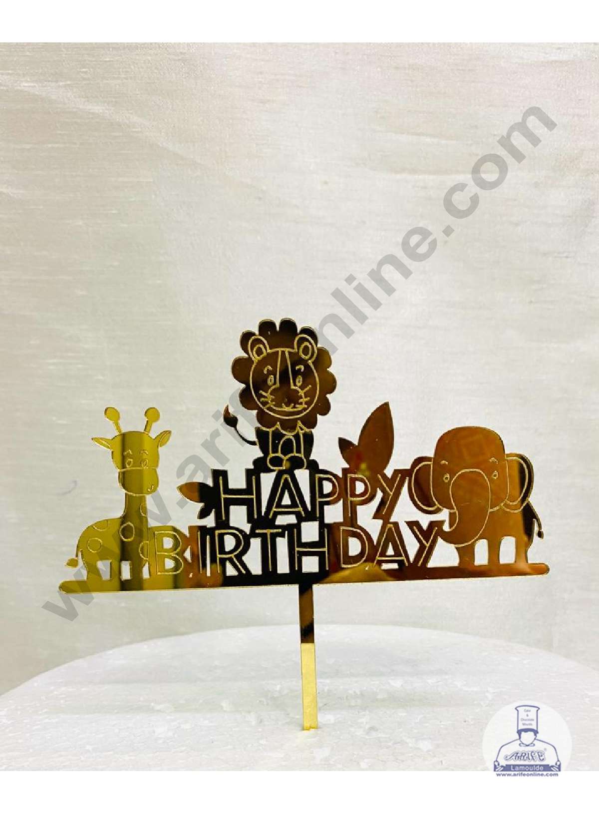 Gold Acrylic Happy Birthday Animal Theme Cake Topper.