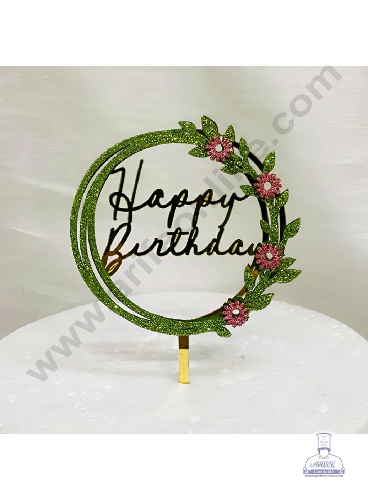 CAKE DECOR™ 5 inch Acrylic Happy Birthday in Green Glitter Round Frame with Light Pink Glitter Flower Cake Topper(SBMT-G-4025)