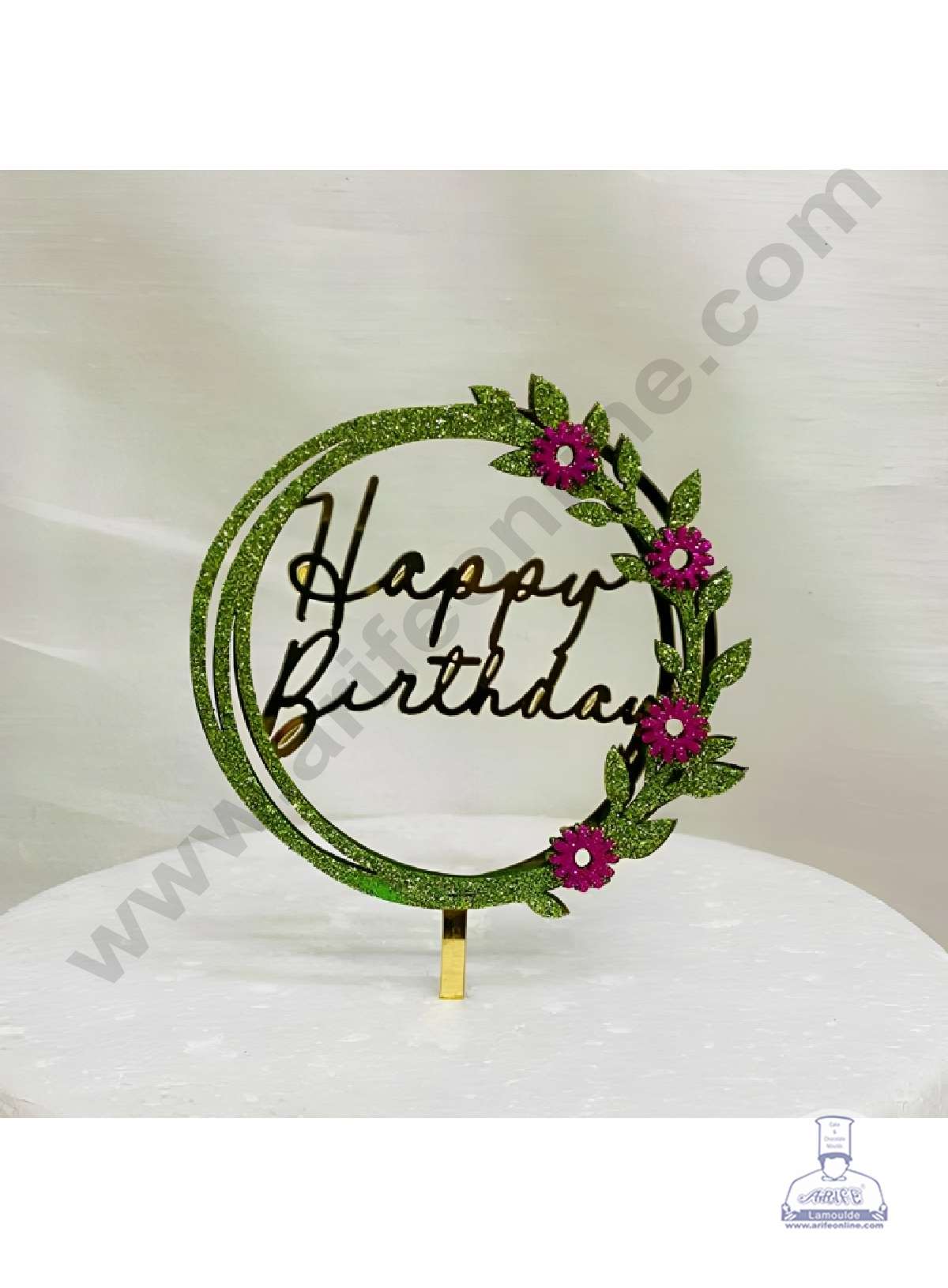 CAKE DECOR™ 5 inch Acrylic Happy Birthday in Green Glitter Round Frame with Pink Glitter Flower Cake Topper(SBMT-G-4024)