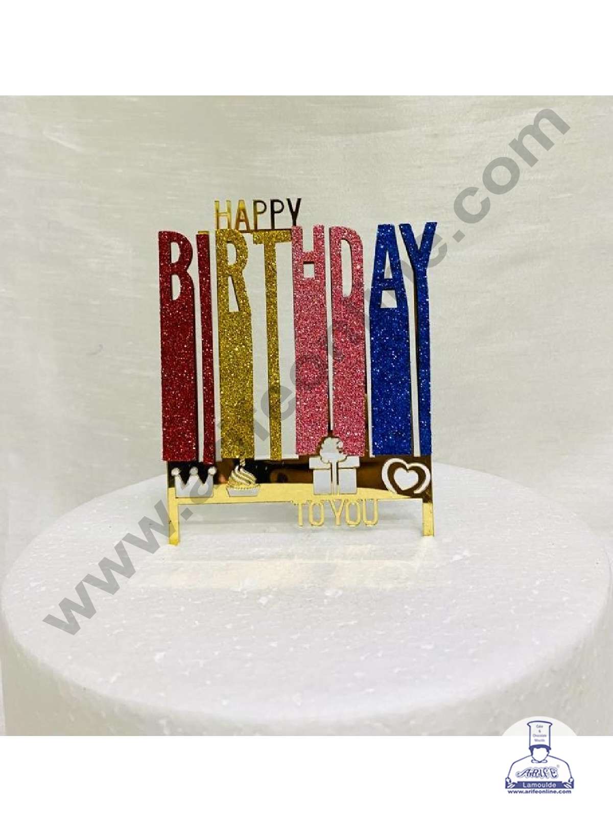 Gold Acrylic Happy Birthday MultiColor Glitter with Gifts, Cake, Heart & Crown Cake Topper.