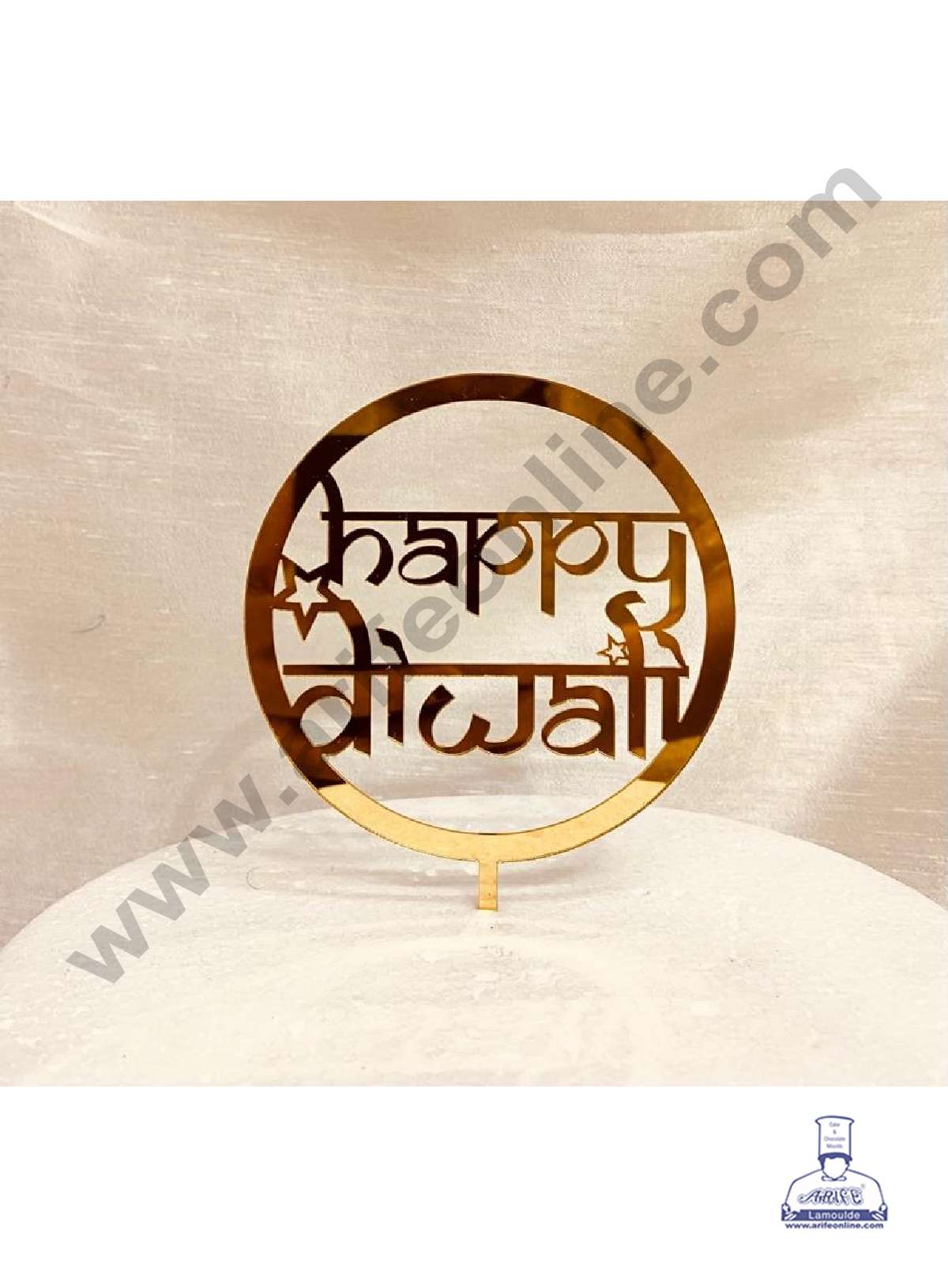 Gold Acrylic Happy Diwali in Hindi Style with Stars Cutout in Round Frame Cake Topper