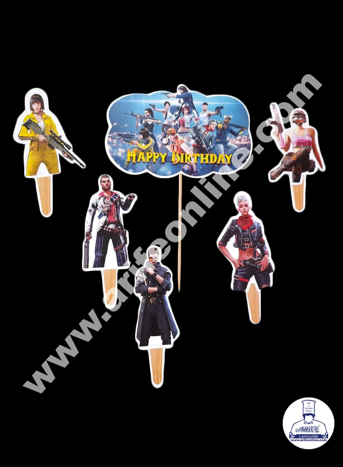 Cake Decor 6 pcs Happy Birthday Freefire Theme Paper Topper For Cake And Cupcake
