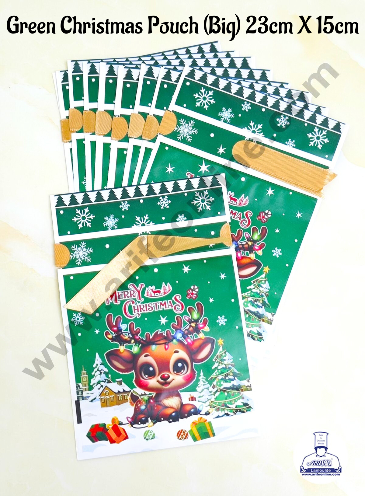Cake Decor β’ Big Green Color Christmas Theme Cookie pouch Plastic Drawstring Bag Treat With Ribbon | Design – 10 | Pack of 10 | (23cm X 15cm)