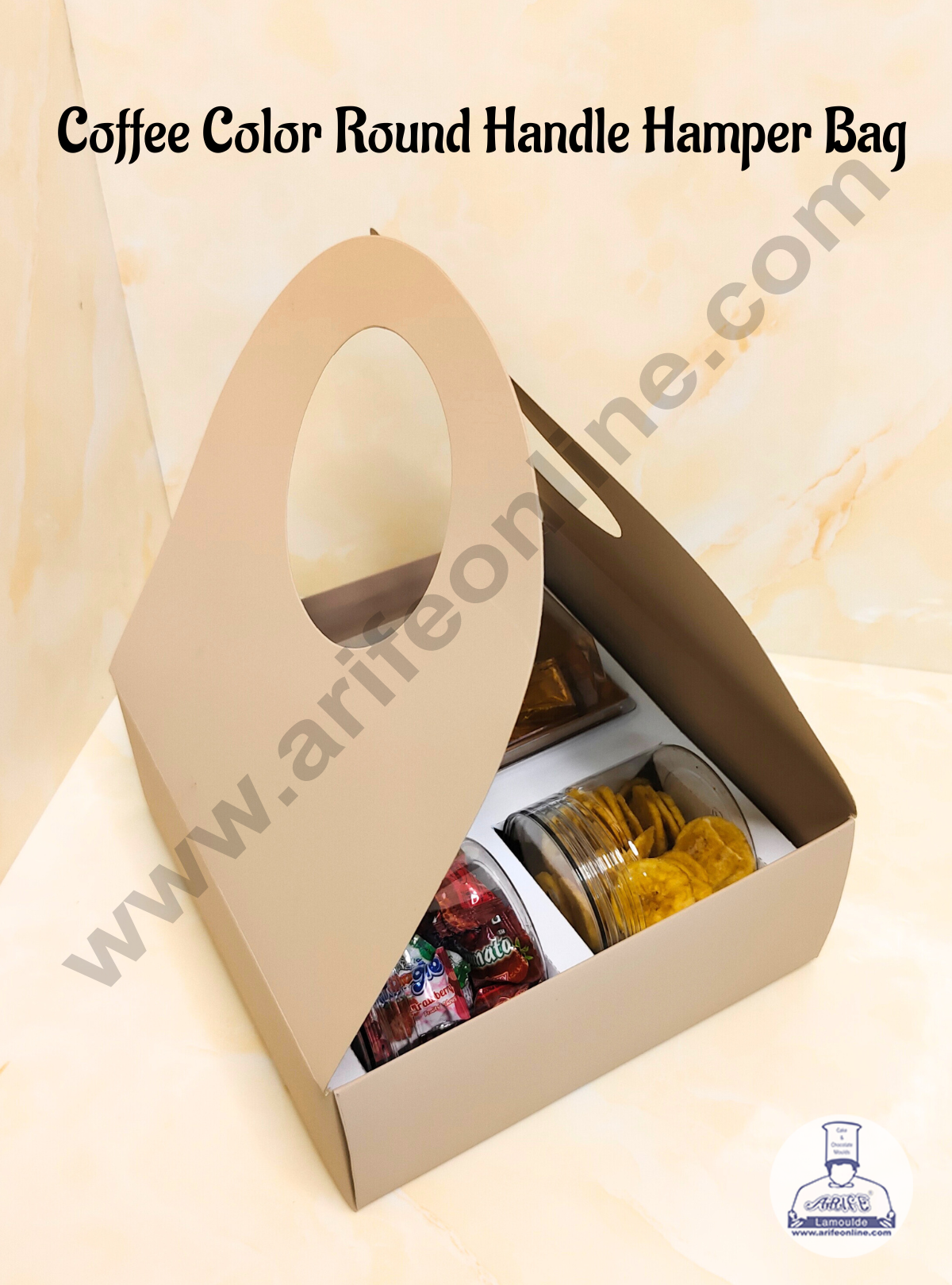 CAKE DECOR™ Round Handle Hamper Box With Cavity (Coffee Color) | Gift Box | Gift Bag With Handle (1 Pc Pack)