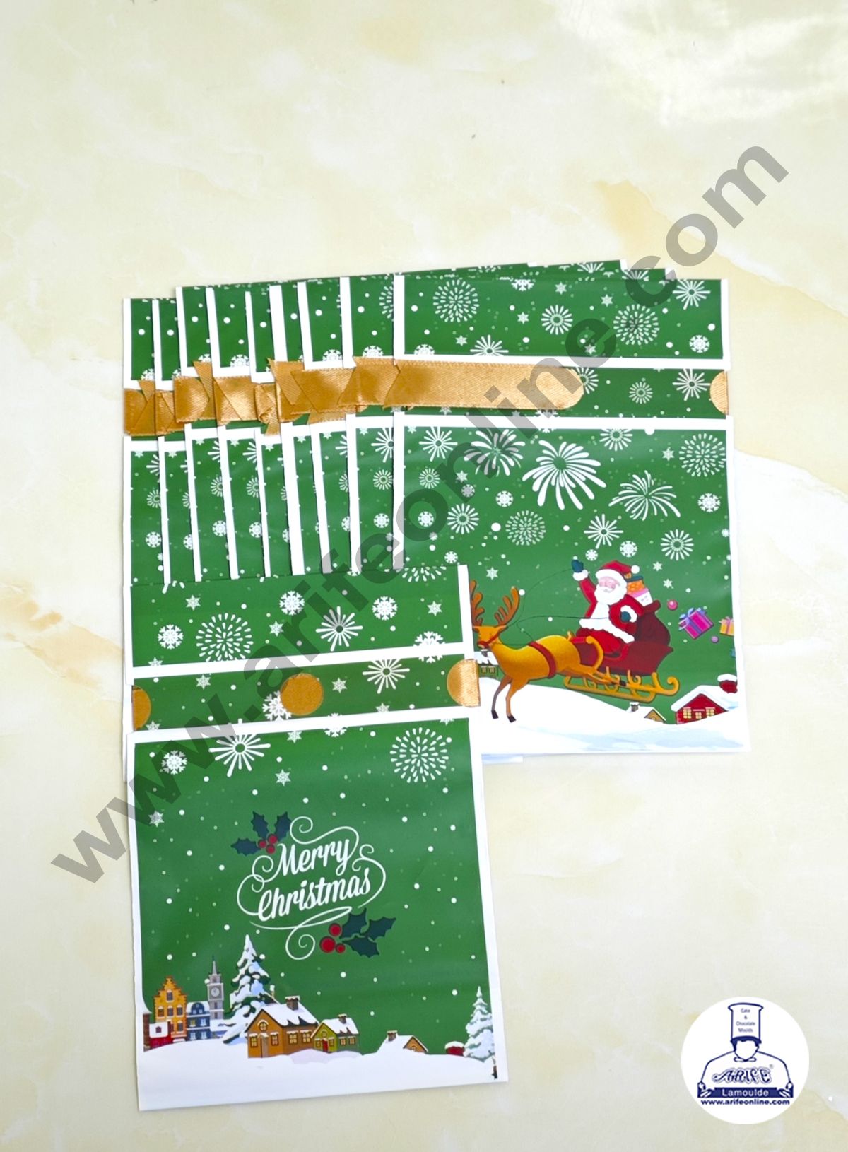 Cake Decor β’ SmallΒ Green Color Christmas Theme Cookie pouch Plastic Drawstring Bag Treat With Ribbon | Design – 08 | Pack of 10 | (12cm X 17.5cm)