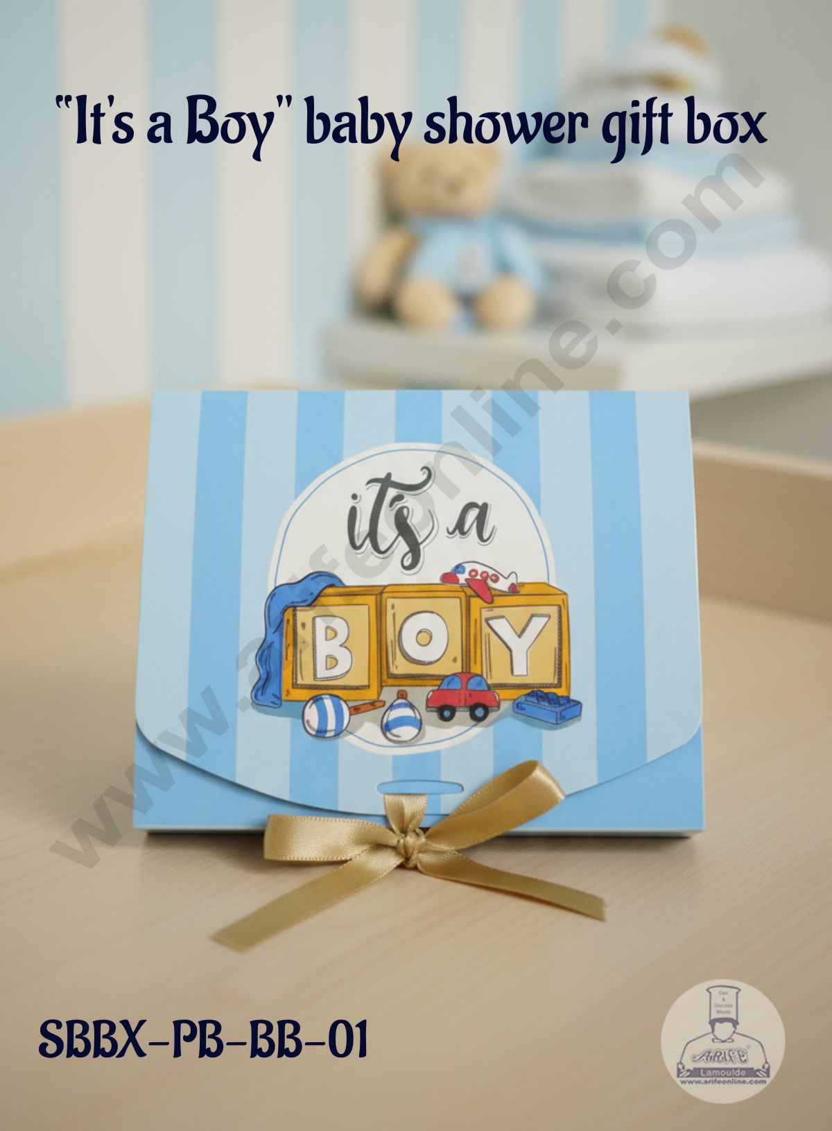“It’s a Boy” baby shower gift box │baby boy gift box │Pastel sky blue │17.5 cm × 14 cm × 5 cm │ SBBX-PB-BB-01│CAKE DECOR™ Light-blue cardboard baby gift box with striped lid, gold ribbon tie and “It’s a BOY” print. Sturdy rectangular box for baby shower favors or keepsakes, playful toy-block illustration, matte finish.…